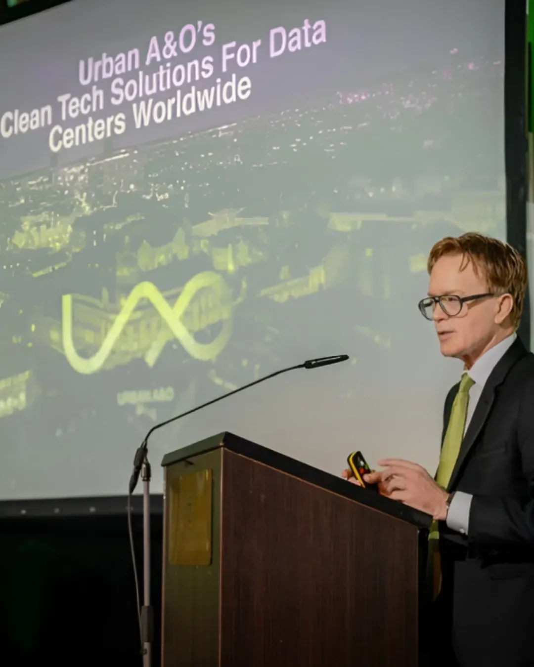Joe MacDonald's outlines Urban A&O's core competencies: carbon neutral data centers, eco resorts, smart cities, green roofs, and plant walls.