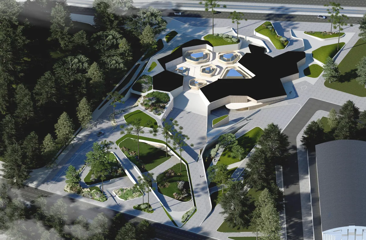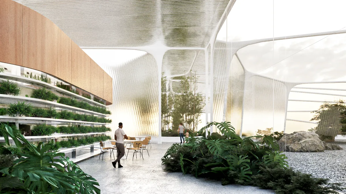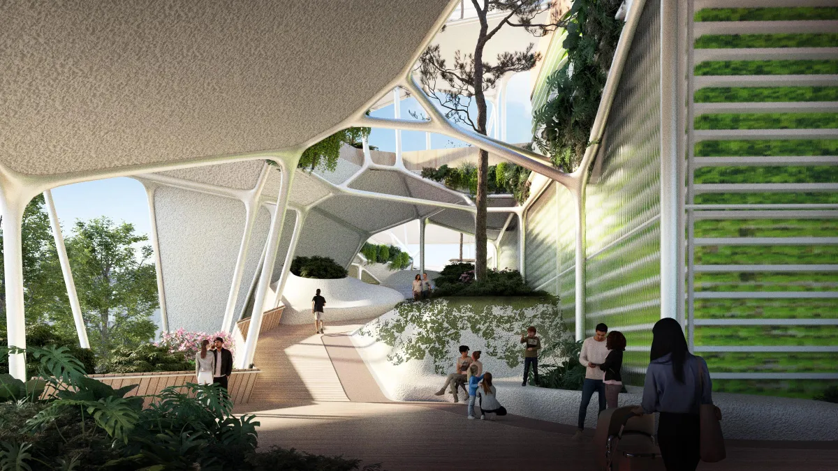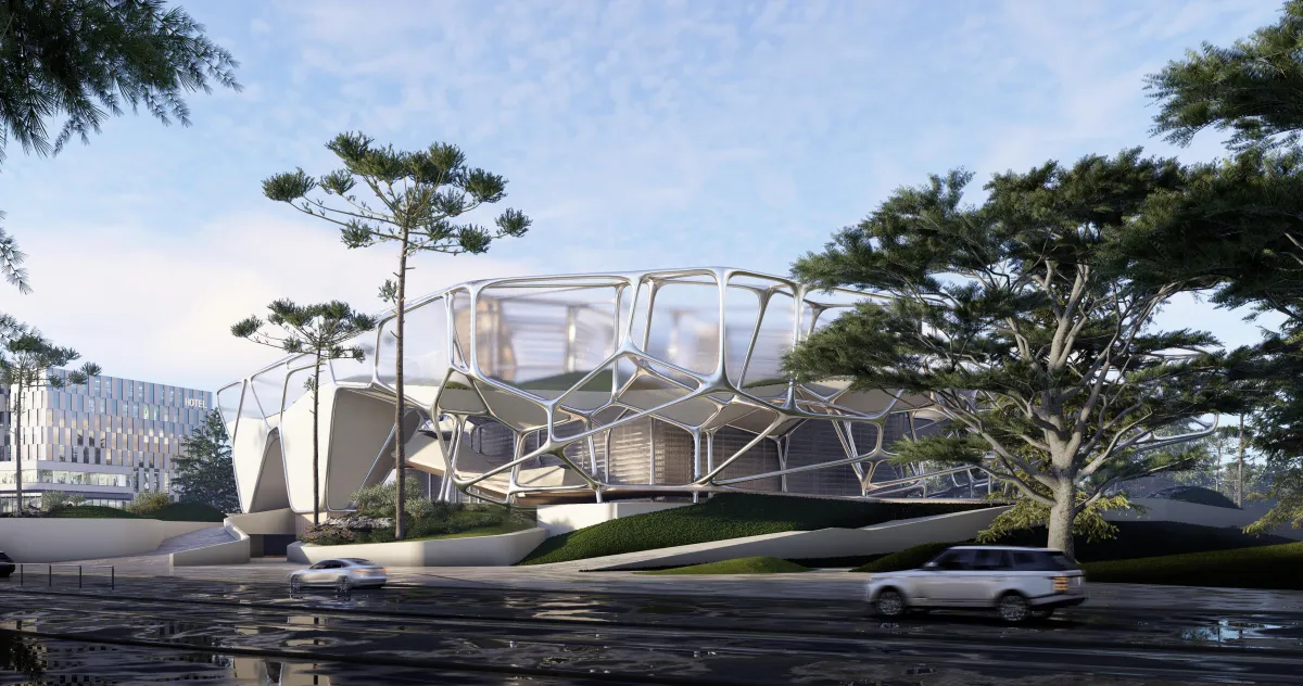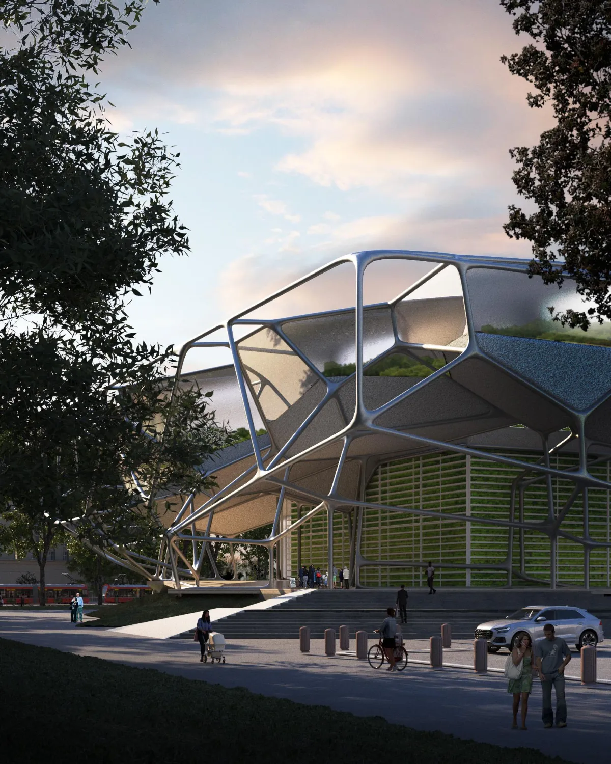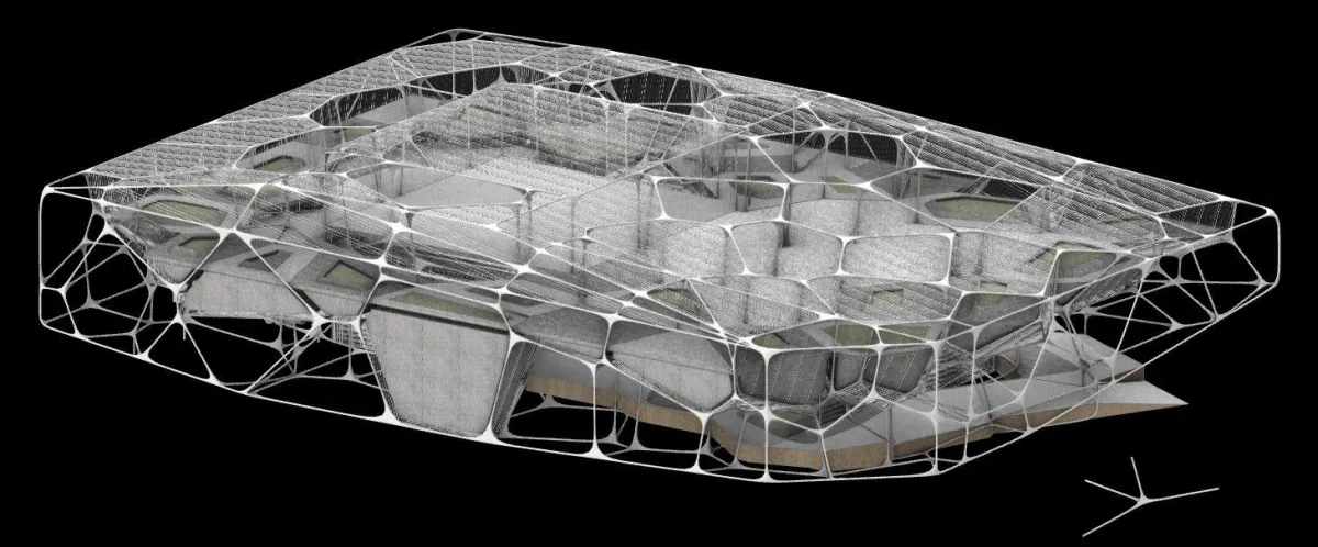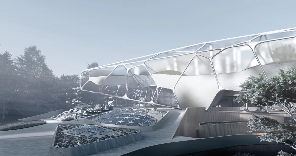 The landscape of the design incorporates both man-made and natural elements. The engineered Voronoi form on top divides the roof with sequentially membrane covers.
