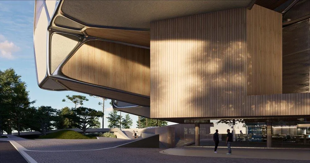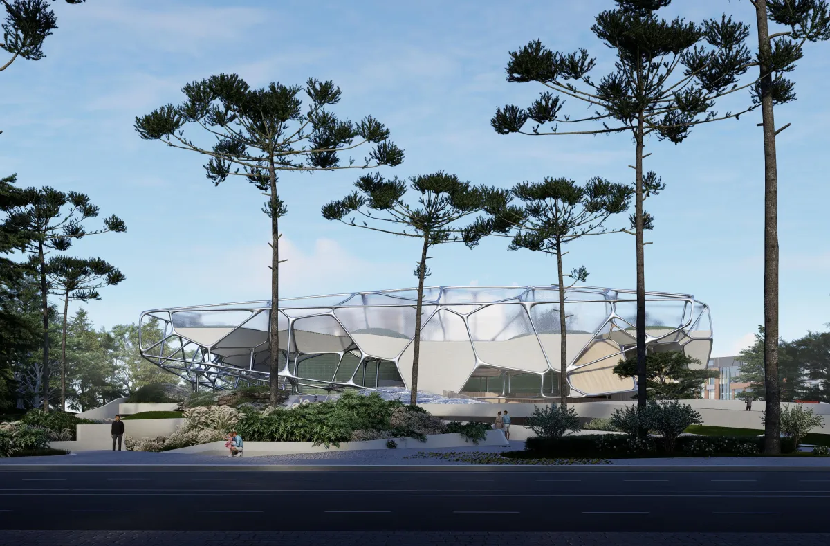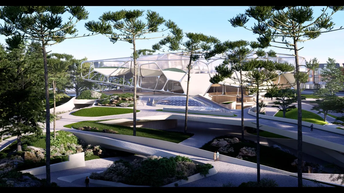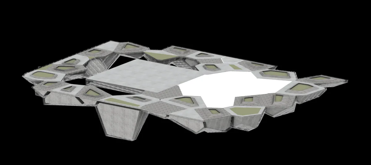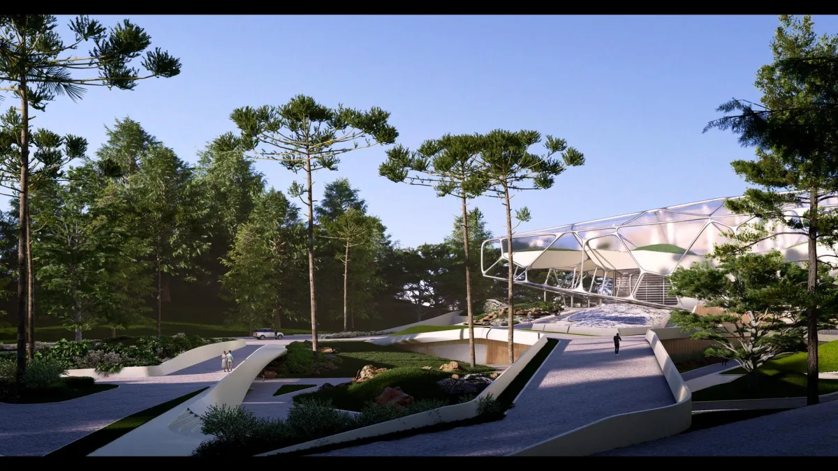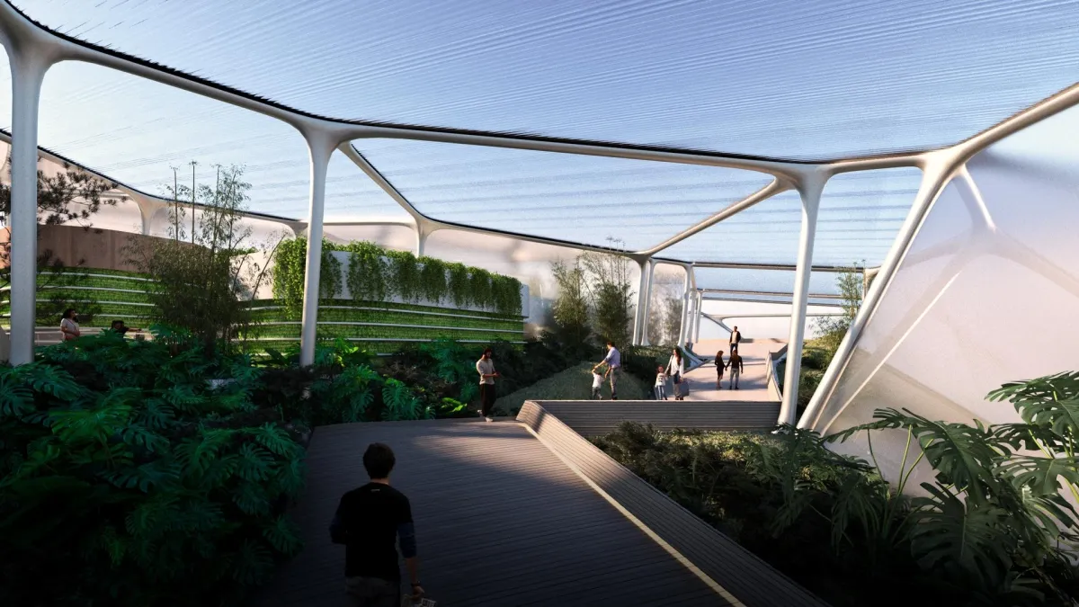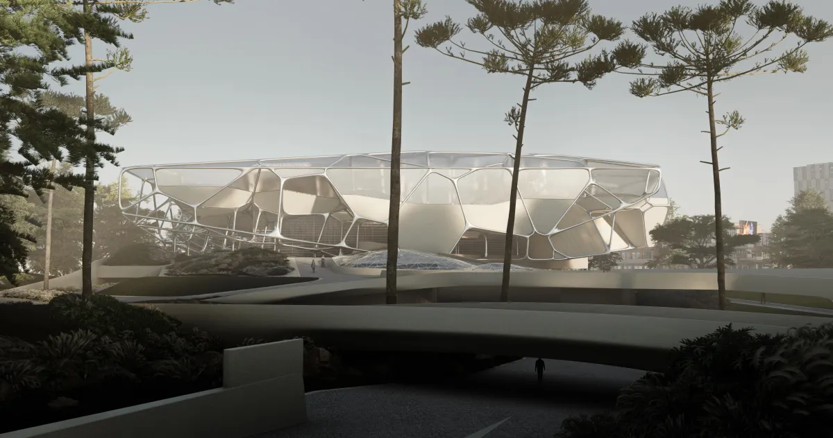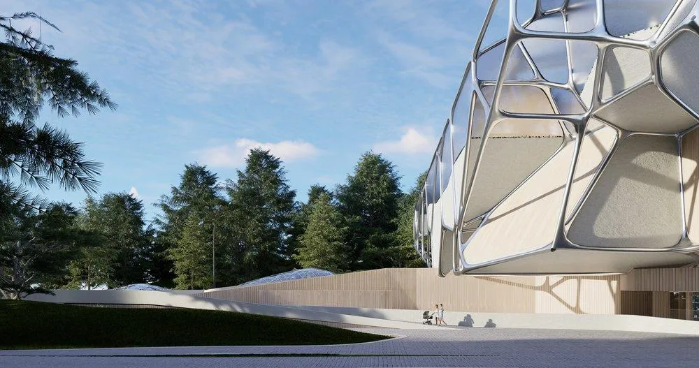 The landscape of the design incorporates both man-made and natural elements. The engineered Voronoi form on top divides the roof with sequentially membrane covers.