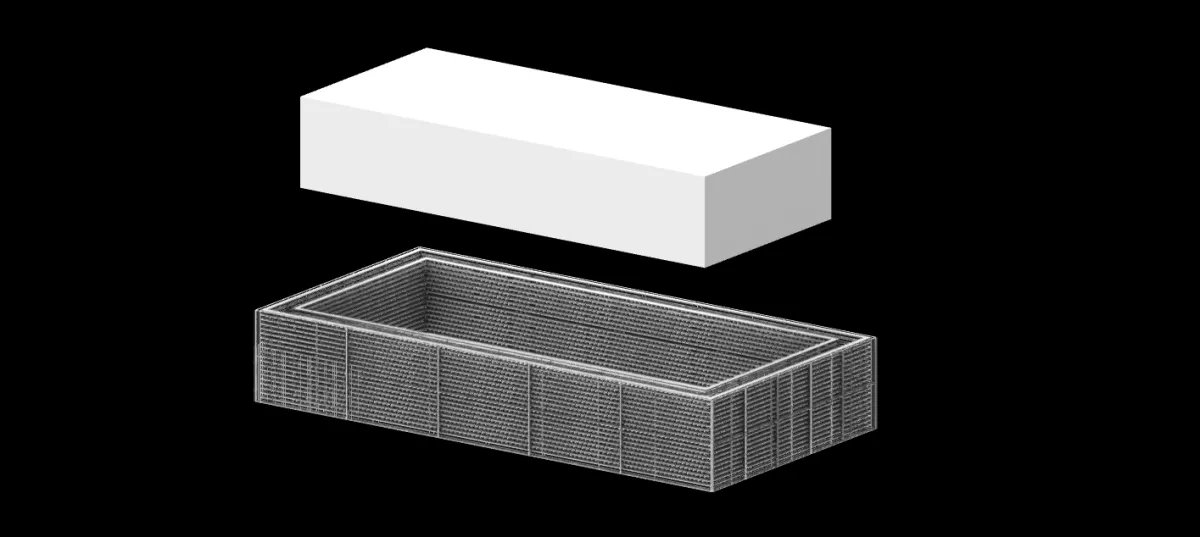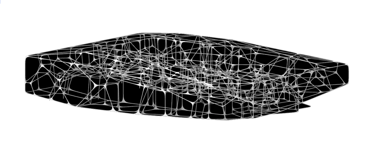The landscape surrounding the Hybrid follows a similar parametric branching of Voronoi geometries, where two interconnecting levels are created. On top, pathways are leading to the Hybrid and the adjacent cultural facilities, and between them are planted areas and resting spots. The previous parking lot, which took up almost all the space, was transported to the underground level.